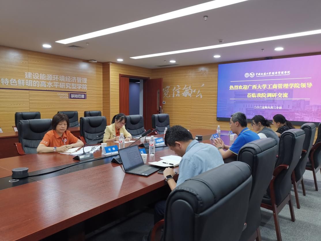 (通讯员 王简辞)6 月 20 日,广西大学工商管理学院研究生管理中心主任、MBA 教育中心主任叶映,研究生秘书邓素媛到访我院,就本硕博一体化培养、人才培养保障等议题展开深入交流。我院学术副院长池毛毛携博导代表及相关工作人员参与座谈。