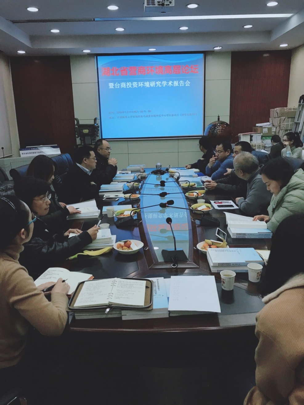 (通讯员吴磊、谢伟伟)2018年1月17日,“湖北省营商环境高层论坛暨台商投资环境研究学术报告会”在英国威廉集团区域经济与投资环境研究中心学术报告厅举行。湖北省台办王光斌处长、朱琨科长,经管学院杨树旺副院长、区域经济与投资环境研究中心邓宏兵教授,以及相关研究领域的专家、师生代表共计30余人参加了会议。邓宏兵教授主持了会议。