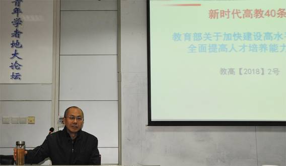 会议首先由副校长刘勇胜教授做了教育部《关于加快建设高水平本科教育全面 提高人才培养能力的意见》(简称“新时代高等教育40条”)的解读报告。刘勇胜副校长从三个方面进行了讲解。