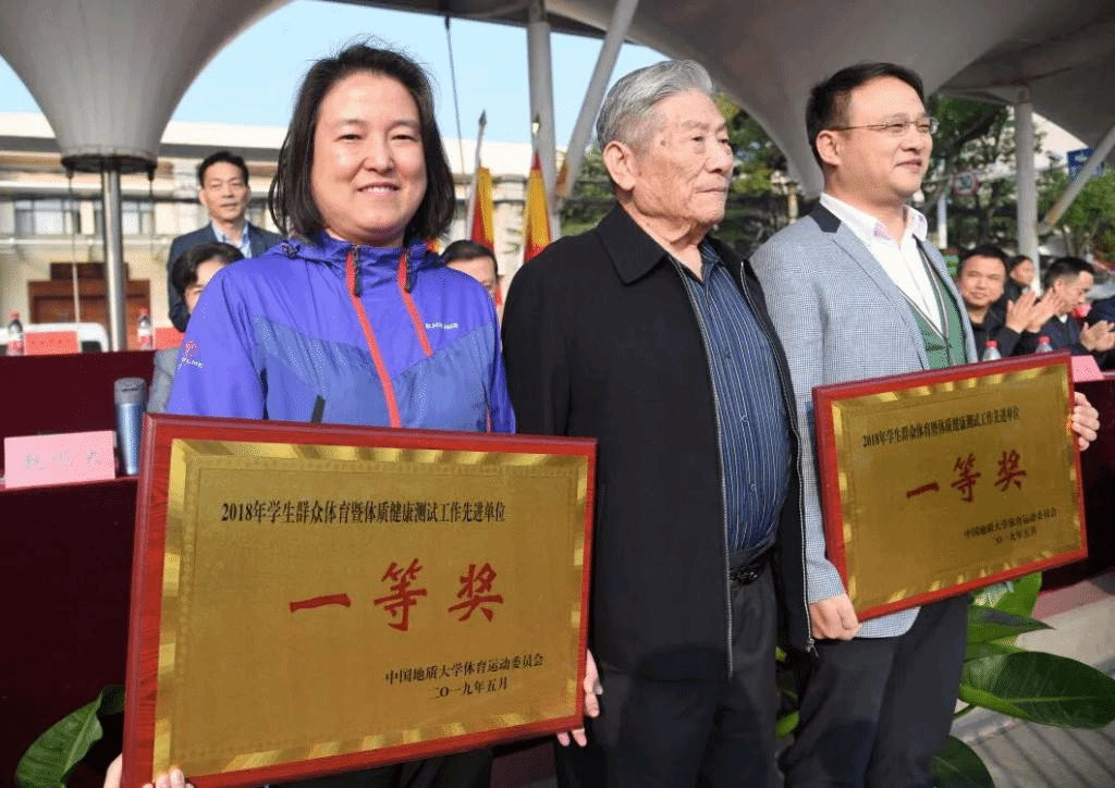 2019年11月8日,在一年一度的校田径运动会开幕式上,校体育运动委员会公布2018年度学生群众体育暨体质健康测试工作先进单位名单,我院再度蝉联一等奖,赵鹏大院士亲手为我院颁发奖牌。