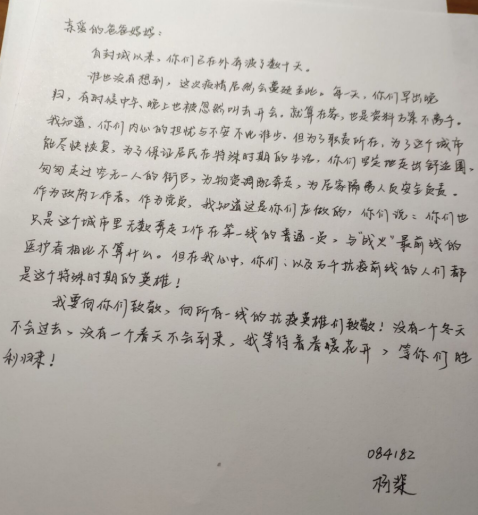 每当柯棐浏览新闻时,看到正是在党和政府领导下,无数基层工作人员勠力同心,勇往直前,才使得无数人民在家中得到护佑,心中的敬意和自豪便油然升起:“我骄傲于自己的父母作为党员能够坚守岗位,更愿意陪同他们用自己的方式和力量守护国家、守卫人民、守护家乡。”