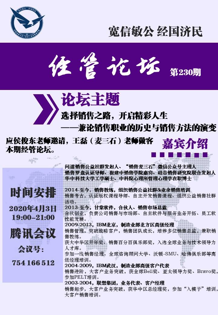 (学生记者郭振华)4月3日晚,230期经管论坛在腾讯会议平台如期举办,应工商管理系侯俊东老师邀请,资深销售教练王磊老师做客本期论坛,为同学们展开“选择销售之路开启精彩人生”的主题讲座。工商管理系主任刘家国、系支部书记刘耕等老师与百余位工商管理系学子参与论坛交流,辅导员努尔夏提•居勒提老师主持活动。