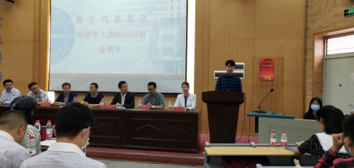 2017级经济学专业的牛金叶作为老生代表,与大家分享了在学院生活和学习的感悟。牛金叶同学结合自己三年的大学体悟,向新生们提出了自己的建议,她希望同学们能拥抱时代、直面挑战;怀抱梦想、认真投入;坚定理想、勇于担当。