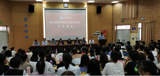 典礼在全体起立高唱国歌中开始,院长杨树旺致辞,对新生的到来表示了热烈欢迎。围绕院训“宽信敏公 经国济民”,杨树旺院长对新生的大学生活提出三点期望:希望同学们热爱祖国,勇担使命;希望同学们把学习当作一种习惯,好读书、勤读书;希望同学们在大学四年的生活中,除了学习知识本领,还要学会做人。最后,杨院长强调了目前仍处于疫情防控期间,同学们应遵循“非必要,不外出”的原则,还应时常进行锻炼,拥有强健的体魄。