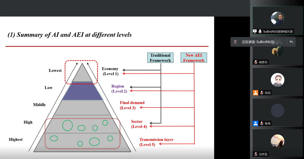 新加坡国立大学能源研究所高级研究员苏斌教授作为主旨演讲嘉宾,以《从生产和需求的角度衡量能源/碳排放强度》为主题,分别从生产端和需求端综合阐述了能源/碳排放强度的测算方法。苏斌教授指出,从生产端来衡量能源/碳排放强度会出现一些不容易理解的现象,以能源强度为例,是否能源强度低的行业,就一定为绿色行业?因此,仅仅考察生产端是不够的,为研究其内在运行机理,需要思考更深一步的内容,从需求端来考察能源/碳排放强度很有必要。他指出,与传统的生产视角下的AI定义相比,AEI的度量可以从需求视角解释不同需求类别对排放和附加值的相对贡献。对一个国家以及区域来说,从需求端来考察能源/碳排放强度,可以看出哪个行业对减排的贡献度;同时,也可以看出一个行业的潜在影响。