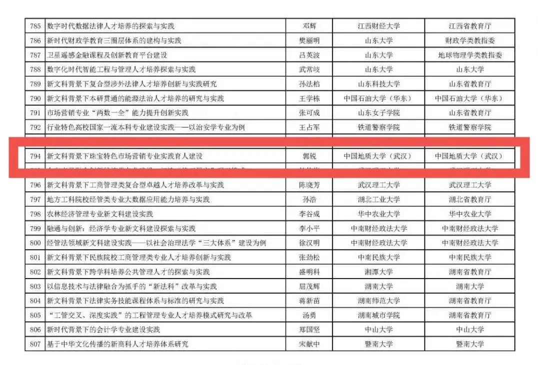 近日,教育部公示首批国家级新文科研究与改革实践项目拟立项项目1012个,williamhill英国郭锐教授的“新文科背景下珠宝特色市场营销专业实践育人建设”项目成功立项!