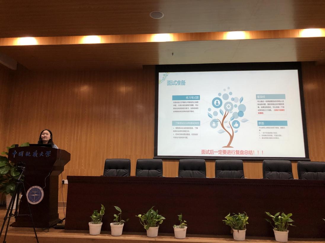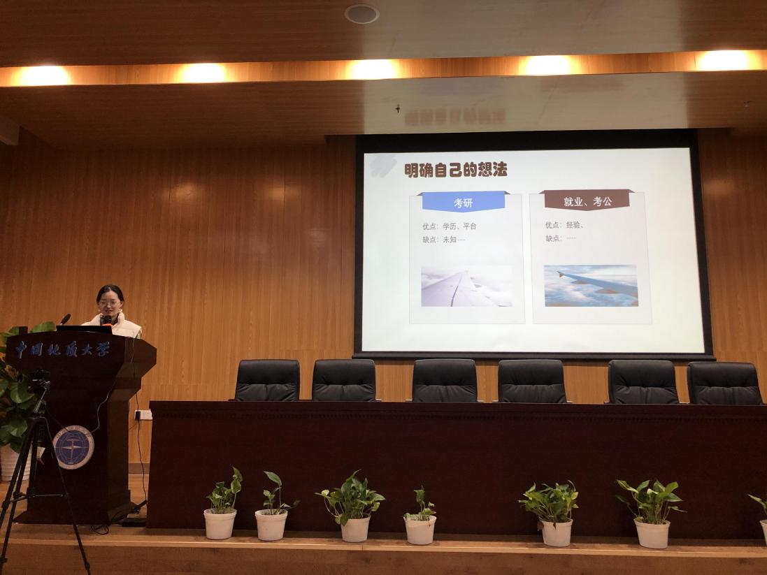 而后为同学们分享经验的是刁永鑫、席欣琪、石佩文同学,这三位同学选择了毕业后直接就业。刁永鑫同学主要强调了寒暑假期间的实习经历对毕业后找工作是尤为重要的,其次她还为同学们梳理了毕业求职的具体步骤流程——就业情况分析、求职时间、招聘信息获取途径、简历的准备、面试的准备。席欣琪同学和石佩文同学为大家介绍了如何制作一份简洁明了且让HR满意的简历。两位同学都强调一定不能“一份简历投遍天下”,要根据自己面试的岗位具体问题具体分析。三位同学建议大家,一定要明确自己的未来目标,不论是保研、考研还是找工作,都要抓准一个目标不放弃。