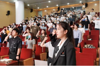 会议第一项,全场奏唱中华人民共和国国歌,随后在领誓人李柯依的带领下,全体党员起立,面向党旗举起右拳,进行庄严的入党誓词宣誓。