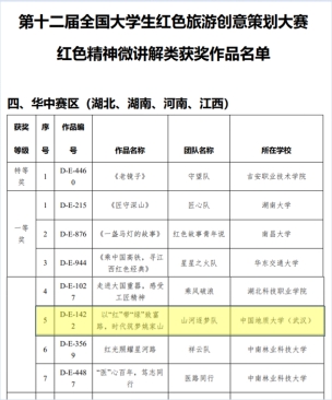 2022年6月30日,在中国共产党成立101年纪念日前夕,第十二届全国大学生红色旅游创意策划大赛初赛结果公布,williamhill英国李会琴老师指导的“山河逐梦队”(学生成员:刘婉婷、赵芳琪、龙心滢、吴胜珍、加里)荣获“红色精神微讲解”类华中赛区一等奖。这是我院连续两年在该项大赛中获奖,作品质量和奖项等级都实现了新的突破。