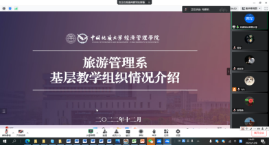 鄢志武教授提出将旅游地学相关知识以不同的切入方式和形式有机地融入各专业课的教学内容,从而更好地体现中国地质大学的学科背景,形成地大旅游管理的专业特色。其他教师分别从教学成果、教研论文、教学理念、课程建设等多方面提出了建议。黄珂副教授和刘晶晶副教授作为青年教师,分享了听取教学团队汇报后的收获,结合在教学中遇到的问题和感悟提出提升青年教师教学能力的一些措施。