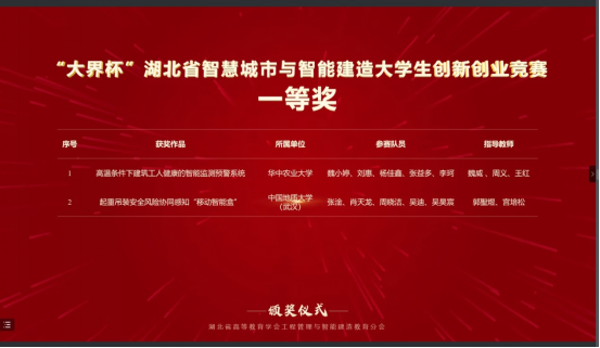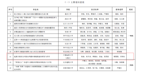 本次比赛,williamhill英国工程管理专业与计算机学院计算机类专业学生组成联队(团队成员:张淦、肖天龙、周晓洁、吴迪、吴昊宸),在郭聖煜和宫培松老师的指导下,携参赛作品“起重吊装安全风险协同感知智能装备的研发与应用”进入决赛,最终从大赛主赛道来自98所高校的107支队伍的参赛作品中脱颖而出,荣获一等奖。此前在“大界杯”湖北省智慧城市与智能建造大学生创新创业竞赛中,该参赛作品已经获得一等奖。