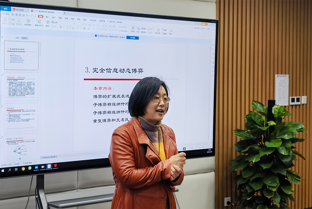 经济学系陈艳老师示范了《博弈论》课程中完全信息动态博弈章节的讲解。陈老师非常具有亲和力,讲课始终面带微笑,举止得体,普通话规范,表述有条理,PPT中图片、表格丰富,例证有理有据,重点、难点的专业知识表达得深入浅出。陈老师通过一个投资小案例,让同学们很快进入“博弈”的状态,让大家意识到不同额度可能面临的投资风险以及相应的投资策略,其本质上也是人心、人性的博弈。同时,通过这个案例也告诉同学们要做一个道德高尚、思维高超、策略高明的人,我们自己不去制造道德风险,但也要做好必要的防范。陈老师授课课堂互动频繁,同学们热情高涨,授课效果非常好。