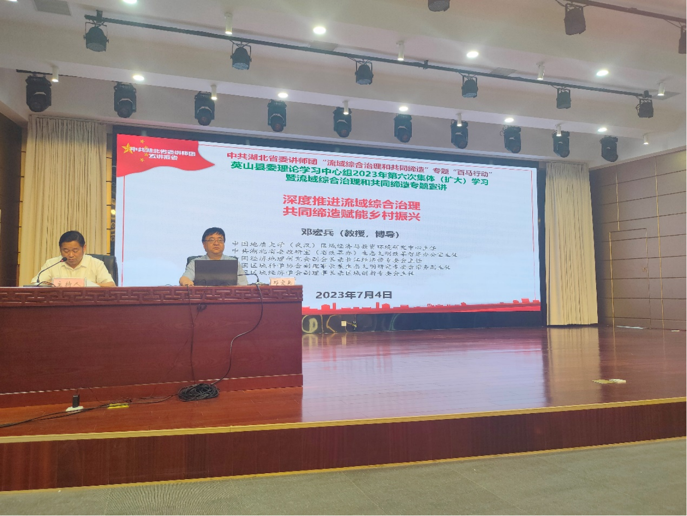 根据中共湖北省委讲师团统一安排部署,7月3日至4日,我院金融与贸易系邓宏兵教授赴英山县参加中共湖北省委讲师团“流域综合治理和共同缔造”专题“百马行动”宣讲活动。7月4日上午给英山县委理论学习中心组2023年第六次集体(扩大)学习做了《深度推进流域综合治理,共同缔造赋能乡村振兴》专题辅导报告。邓教授从深度推进流域综合治理和共同缔造赋能乡村振兴两个角度,阐明如何在实践中把握党的二十大精神,深度推进流域综合治理和统筹发展,自觉践行习近平生态文明思想,共同缔造谱写乡村振兴新篇章,绘制生态优先、绿色发展的蓝图。邓宏兵教授在此次宣讲调研过程中,根据有关部门反映的情况和意见,充分发挥专家优势,针对英山县在流域综合治理和乡村振兴等工作中遇到的问题献言建策,助力其进一步理清工作思路,结合英山优势特色,充分发挥比较优势,推进各项工作高质量发展。