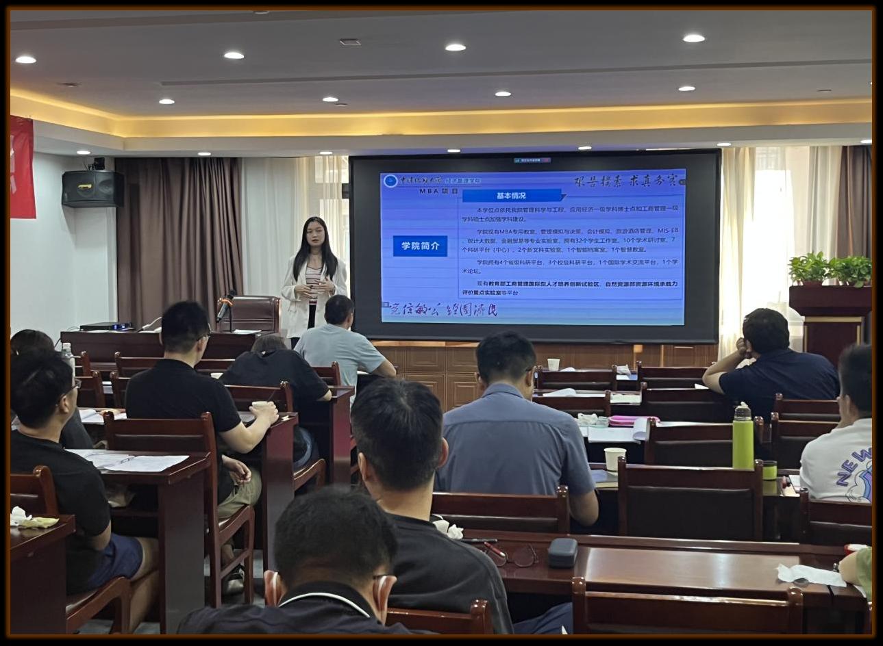 宣讲会上,张老师从学校、学院、MBA项目三个层面层层递进,从点到面,进行多维度项目介绍。从培养方案、MBA特色项目、师资力量、招生政策、国际交流、文化品牌建设等方面进行具体介绍。其中特别指出我校MBA专业特色,注重实践与交流,如不定期组织企业参访、开展丰富的校内校外学生实践交流活动。张老师提出,在地大攻读MBA项目期间,不仅能获得高质量、高水平的学业指导,更能丰富学生课业活动,提升实践能力,拓展人际关系。张老师还列举了优秀MBA在校生及毕业生事迹,为备战考研学子树立信心。