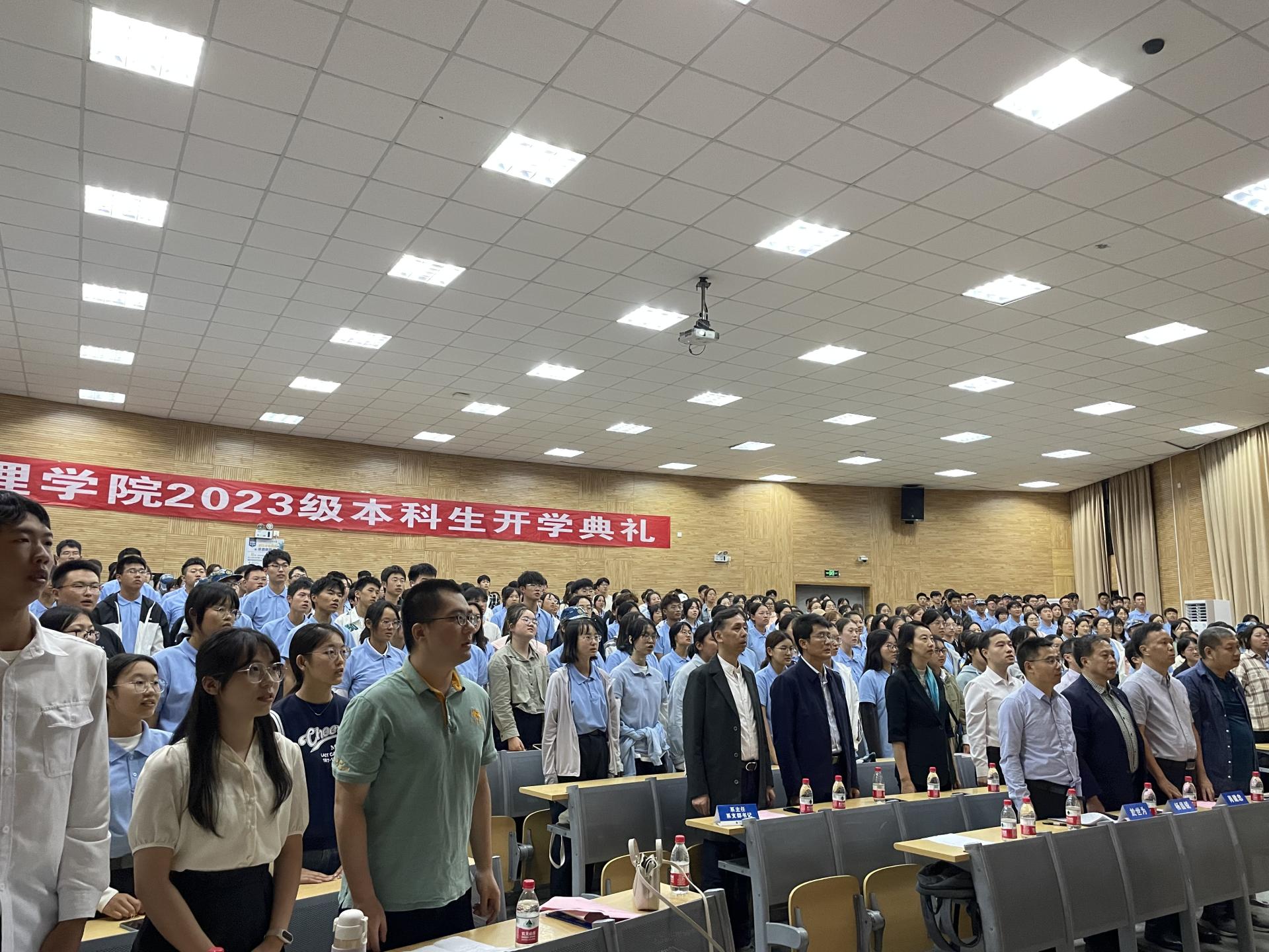 典礼第一项,全体师生起立,奏唱国歌,开学典礼由此拉开帷幕。