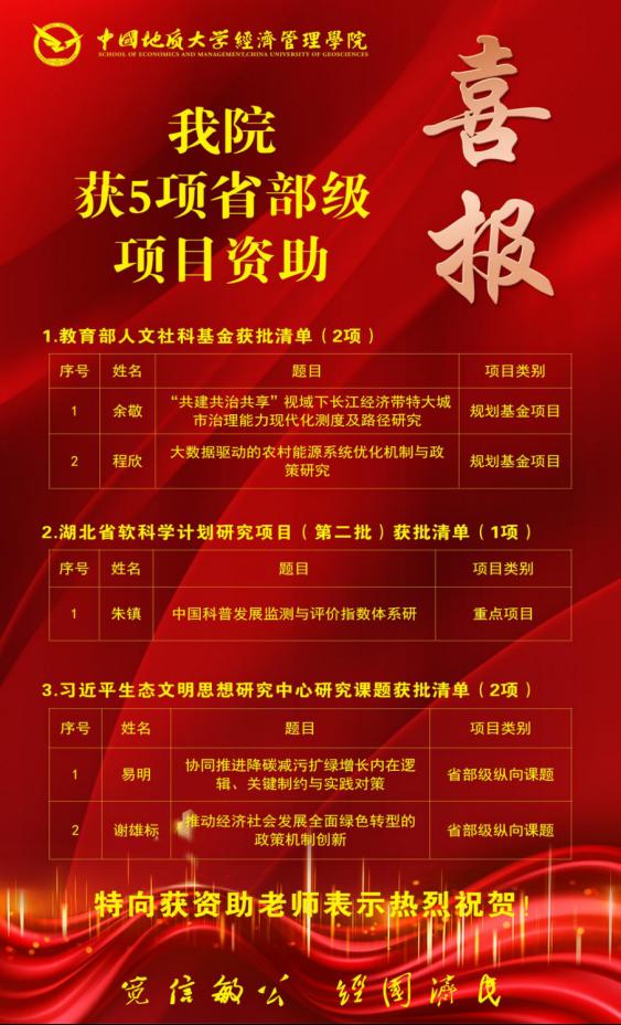 (通讯员 胡松琴)近日,随着2023年度教育部人文社会威廉希尔一般项目评审结果的公示、2023年湖北省软科学计划研究项目(第二批)拟立项项目向社会公示、习近平生态文明思想研究中心2023年度研究课题的公示推出,williamhill英国获批省部级项目共5项。其中教育部人文社科2项,省软科学计划研究项目(第二批)重点项目1项,习近平生态文明思想研究中心研究课题2项。具体名单如下: