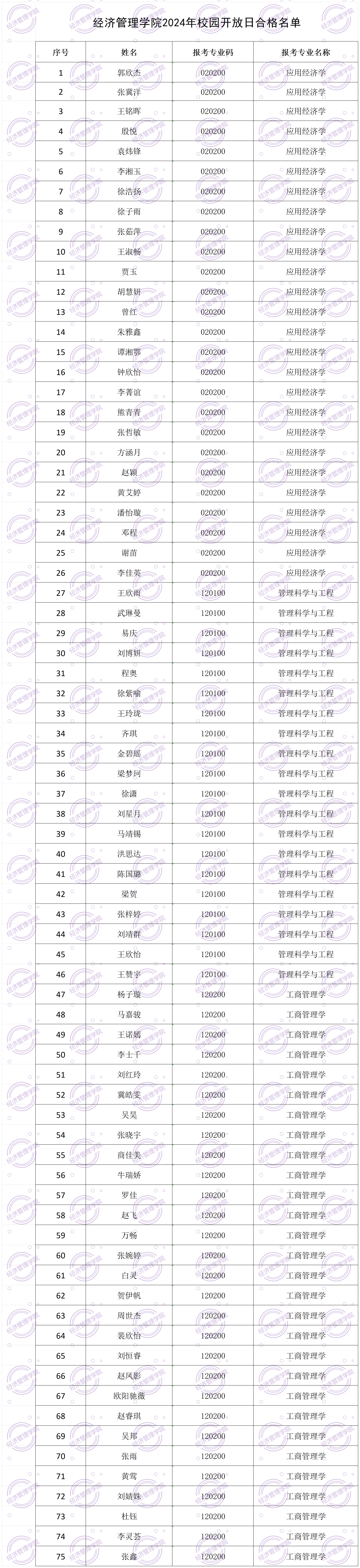 6月27日-28日,我院应用经济学、管理科学与工程和工商管理三个专业进行了第十届研招校园开放日活动,现公布本次活动日优秀营员名单如下: