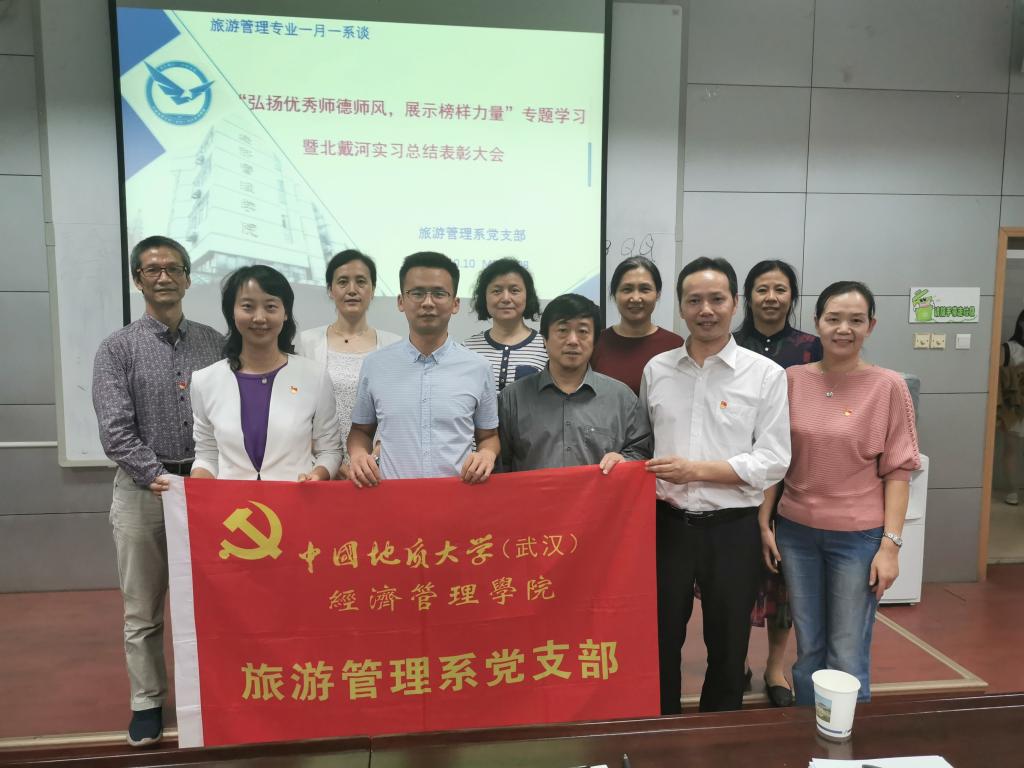 2019.10.10下午,williamhill英国旅游管理系党支部邀请学院学工组,共同组织旅游管理系085181班、经管学院08s197班,以及旅游管理系2019级研究生,在MBA208召开了“弘扬优秀师德师风,展示榜样力量”专题学习暨北戴河实习总结表彰大会。参加本次活动的有经管学工组赵家玮老师,旅游管理系李江敏、肖拥军、李会琴、鄢志武、唐嘉耀、梁玥琳、庄小丽、张俊霞、董淑霞等10位老师。