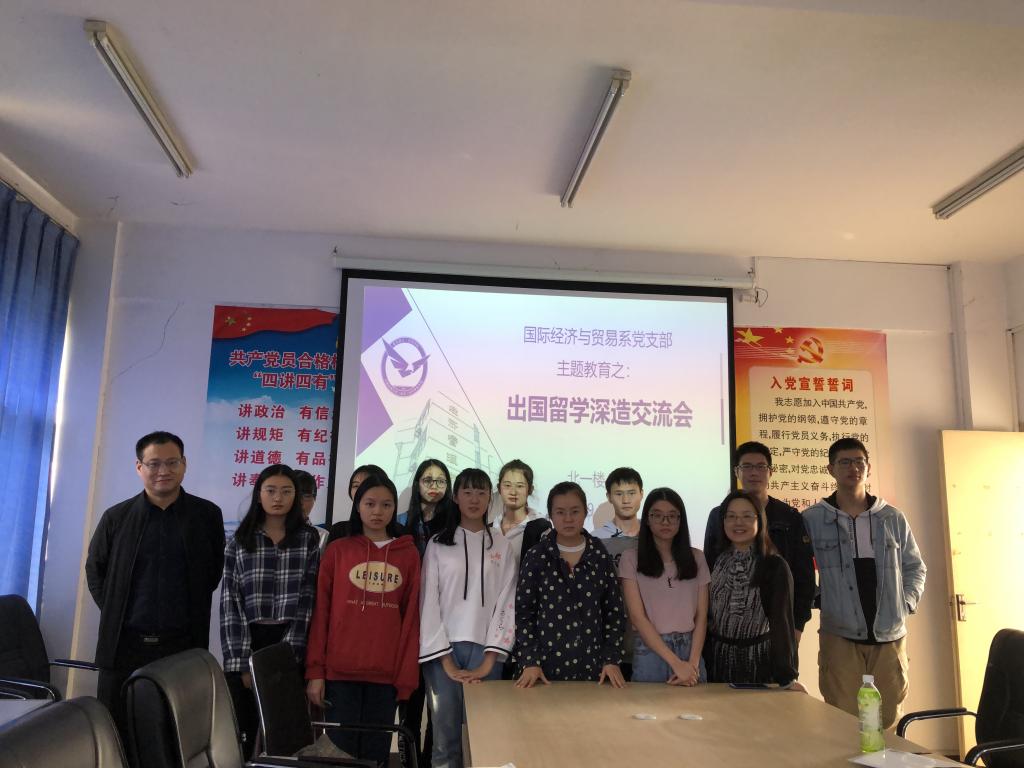(通讯员:易杏花 苗瑞瑞)2019年10月24日14:00—16:30,williamhill英国国际经济与贸易系党支部在北一楼421室召开了出国留学深造交流会,这既是党支部“结对领航”的一项重要工作内容,也是“不忘初心 牢记使命”主题教育的一个重要环节。活动由国际经济与贸易系党支部书记易杏花主持,系主任白永亮、系副主任洪水峰,国贸系2016级本科生田翔、安浩楠、邓学霖,以及17级——19级有志于出国留学深造的学生参加了本次活动。