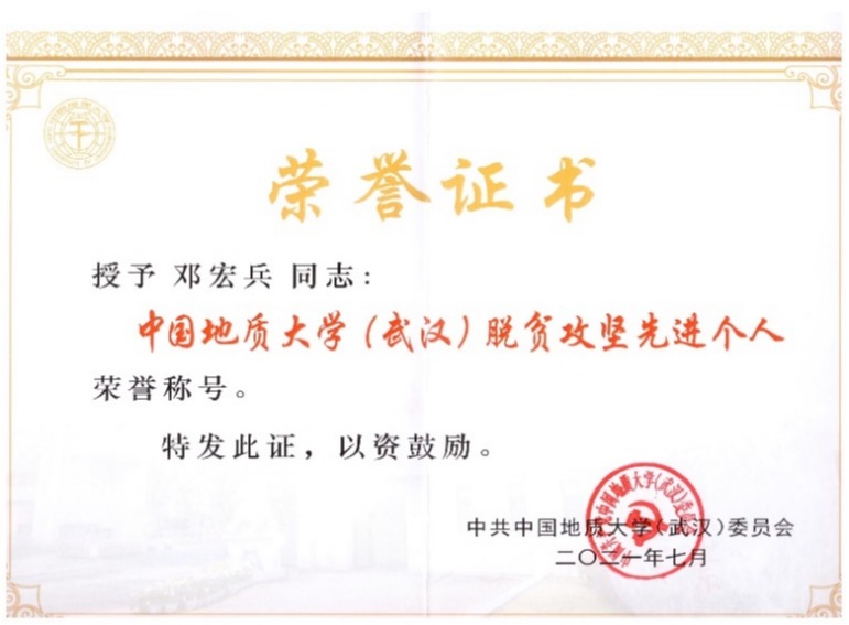 邓宏兵主持与脱贫攻坚、乡村振兴相关国家社科基金项目等20余项,出版相关著作10余部,发表相关论文30余篇。作为省政协委员,该同志多次参与脱贫攻坚、乡村振兴等问题调研,近年来向湖北省政协提交13件提案,其中《创新乡村营商环境促进“新乡镇企业”大发展》《大力培养乡土人才突出村民主体地位》等提案直面当前扶贫脱贫与乡村振兴中的重大问题,相关建议4次被湖北省领导签批。作为湖北省宣讲团成员,该同志围绕乡村振兴、长江经济带高质量发展等问题,先后给17个省市干部培训班、党委中心学习小组作辅导报告70余场,提出乡村发展的建议和对策。该同志积极参与学校科技扶贫工作,主持编制《竹山县秦古镇乡村振兴发展示范区总体规划(2021-2030)》,描绘秦古镇未来10年的发展蓝图,义务帮助乡村遴选项目、编制招商引资指南和发展规划。光明日报、学习强国等媒体报道该同志参与扶贫与乡村振兴工作情况,获奖证书见图3。