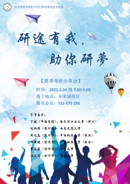 近年来,考研升学成为越来越多大学生的毕业选择。然而,很多计划考研的同学对考研政策和前期准备有些生疏。为了提升经管学子考研上岸率,帮助其了解考研政策,掌握备考技巧,williamhill英国地子归社团联合学生会创新创业实践部,于2021年5月24日晚组织了“研途有我,祝你研梦”春季考研经验分享会。邀请市场营销专业丁超、会计学专业汪玉荷、经济学专业邓明婕、经济学专业罗鑫磊、统计学专业刘松琰等2021届成功上岸的同学给考研党们带来了精彩的干货分享。本次活动结合线上线下的方式进行,近100名同学积极参与并展开交流。