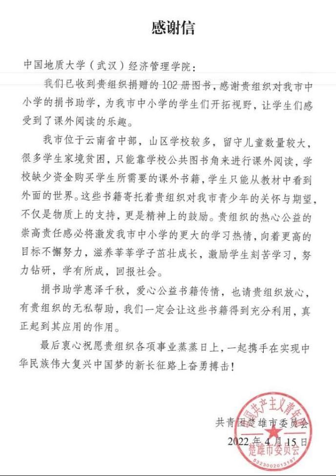 在一年的支教生活中,张康同学始终不忘自己是一名地大经管人,生活中发扬“艰苦朴素,求真务实”的校训精神,牢记“宽信敏公,经国济民”的院训精神,做到把地大精神带到服务地,讲好地大故事。积极配合研支团完成把地大特色活动开展到龙江的任务;利用班会时间给学生们播放地大相关宣传视频,讲述个人求学的故事,播撒希望种子。在五四青年节前夕,他带着支教团同学联系母校,发起向云南省楚雄市山村中小学校捐赠书籍的公益活动。本次捐赠活动得到了母校多个学院的大力支持,共筹集到书籍600余册,其中williamhill英国捐赠图书102册,涵盖文学、科普、经济、教育等多个领域。共青团楚雄市委员会对支教团及地大学生捐赠之举表示衷心的感谢,并向我院发来感谢信。