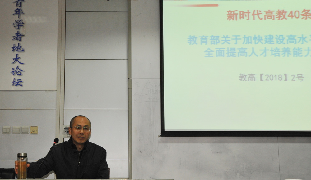 会议首先由副校长刘勇胜教授做了教育部《关于加快建设高水平本科教育全面 提高人才培养能力的意见》(简称“新时代高等教育40条”)的解读报告。刘勇胜副校长从三个方面进行了讲解。
